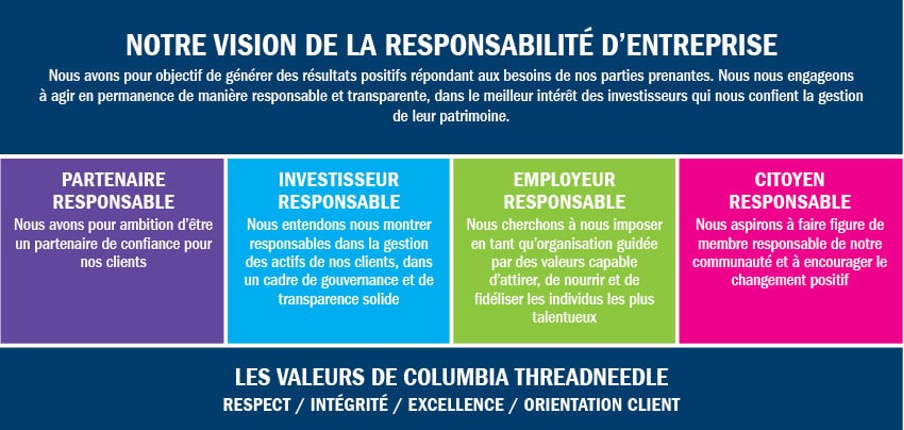 Columbia Threadneedle Investments est un groupe de gestion d’actifs international de premier plan qui propose une large gamme de stratégies et de solutions d’investissement de gestion active aux particuliers, aux fonds de pension et aux entreprises. Nous aspirons à offrir à nos clients les performances qu’ils attendent lorsqu’ils nous confient leur argent, au travers d’une approche collégiale d’envergure mondiale axée sur la recherche et attentive au risque. Nous nous engageons en outre à garantir une approche rigoureuse en matière de responsabilité d’entreprise, étayée par nos valeurs que sont l’Orientation client, l’Excellence, l’Intégrité et le Respect. Nous entendons démontrer notre adhésion à ces Valeurs, dans toutes nos activités.